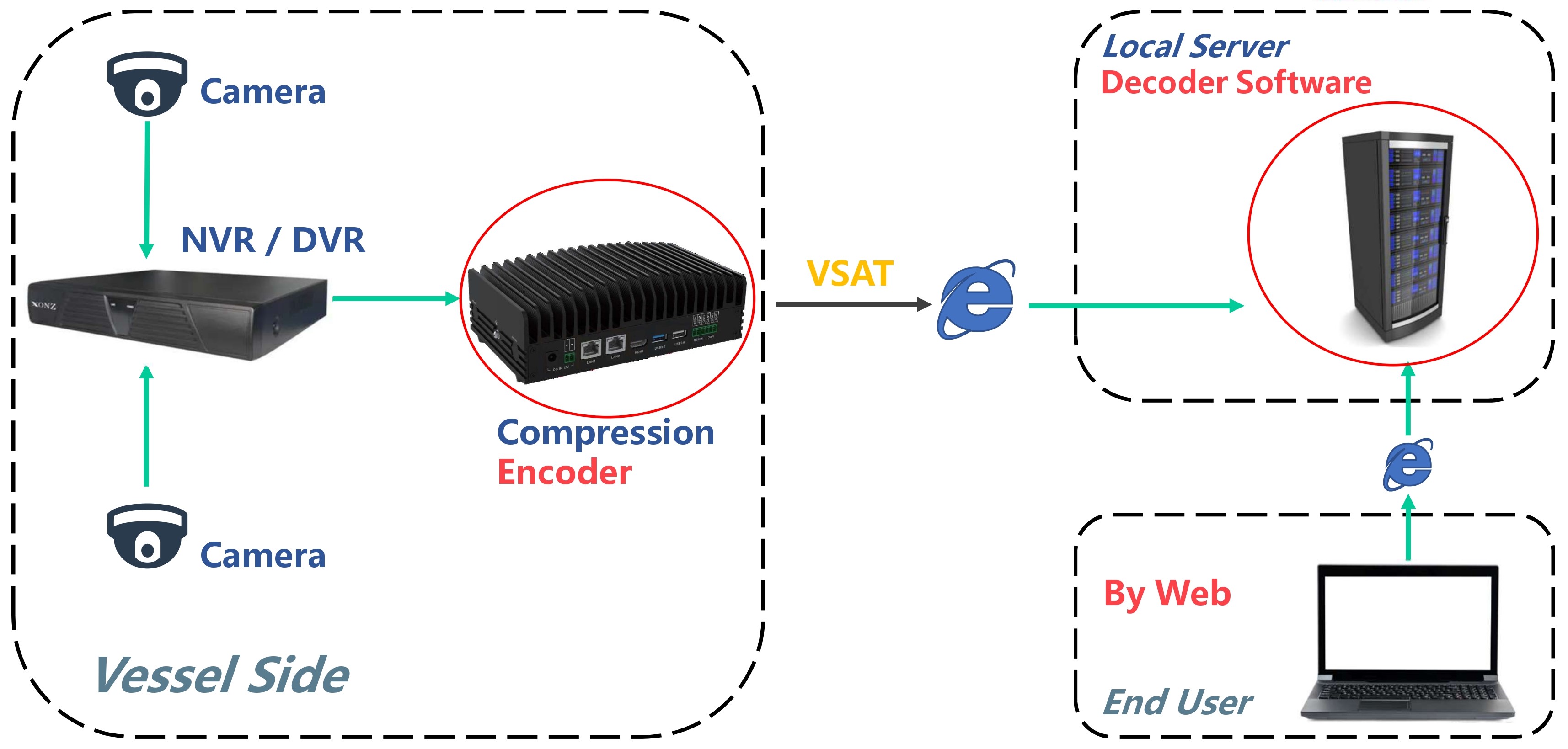 Our CCTV Compression Encoder can be integrated with previous or newly installed CCTV system, and compresses the video streams then send them securely through the vessels’ network (VSAT, 4G, L-Band, etc.) back to your office.